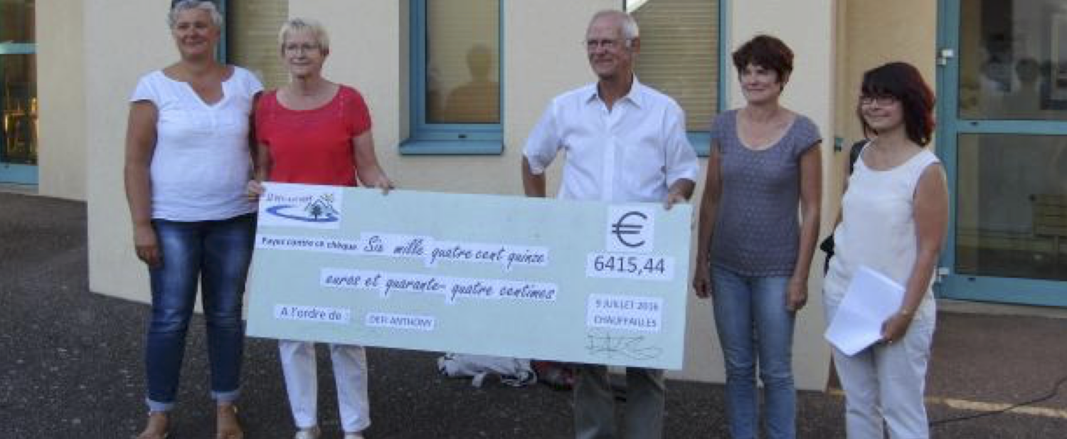 Un chèque de 6 415,44 € a été remis à Claude Vernay, qui représentait le Défi Anthony, vendredi. Il s’agit de la somme récoltée par les organisateurs du défi natation, d’anciens nageurs et le club de natation chauffaillon. Pour rappel, l’événement a eu lieu le 9 juillet à la piscine intercommunale. Lors de cette soirée, 300 personnes se sont relayées et ont nagé 43 kilomètres soit l’équivalent d’un aller-retour entre Chauffailles et Pouilly-sous-Charlieu (Loire). Le principe était simple : composer une équipe de un à quatre nageurs puis réserver un ou plusieurs créneaux de 5 minutes pour nager seul ou en relais. Le coût de l’inscription était de 9 € par équipe pour cinq minutes de natation. En parallèle de ce défi sportif, 310 repas ont été servis.