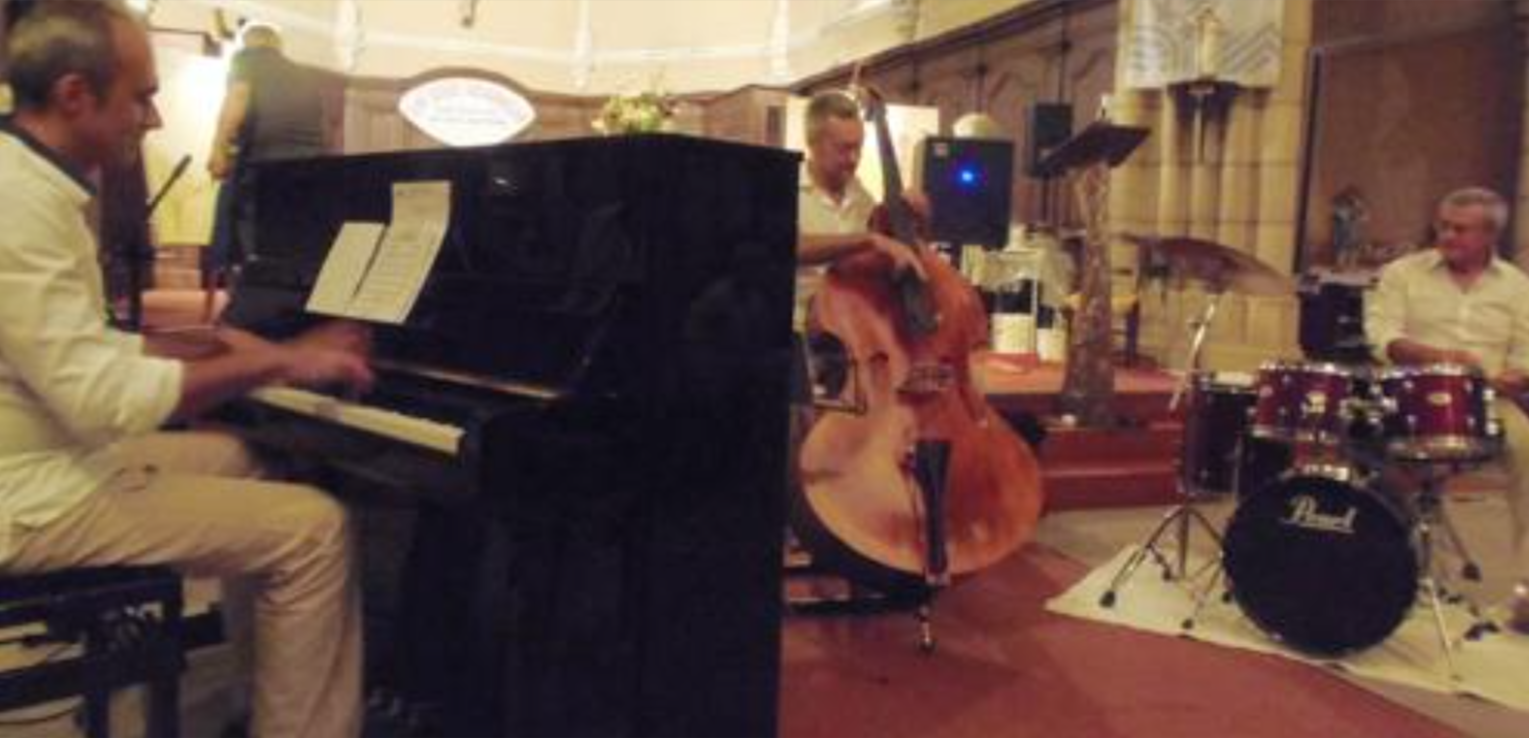 Les concertistes Philippe au piano, Éric à la contrebasse et François à la batterie.